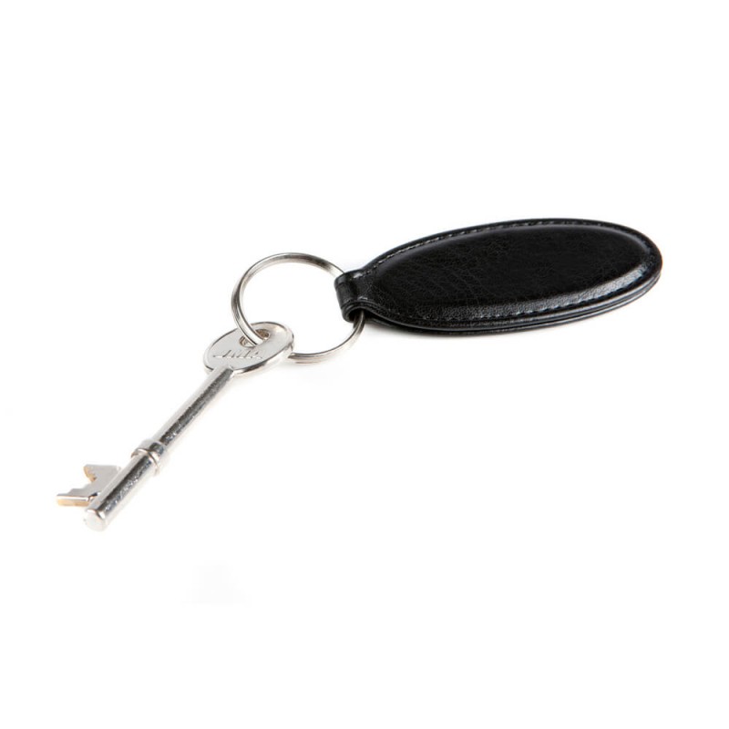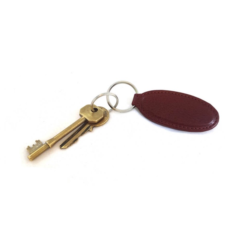 Porte-clé ovale doublé avec les bords repliés et cousus pour une finition de qualité.