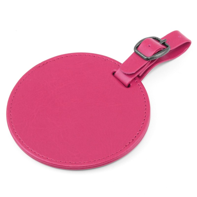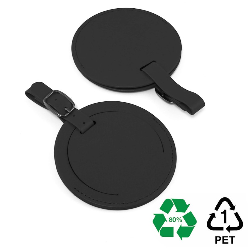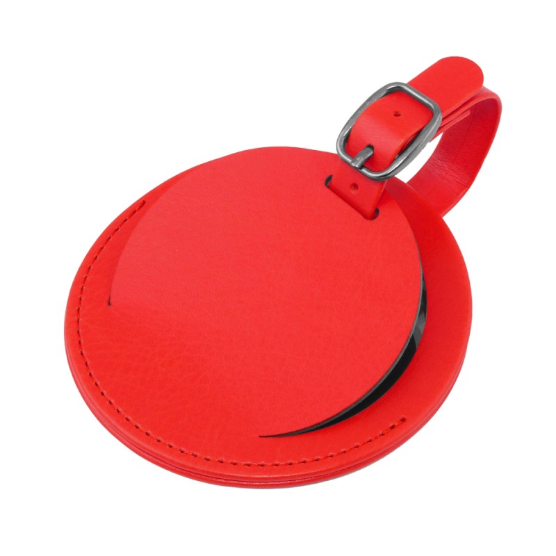 Etiquette à bagage ronde avec volet pour masquer les coordonnées.