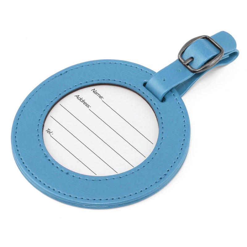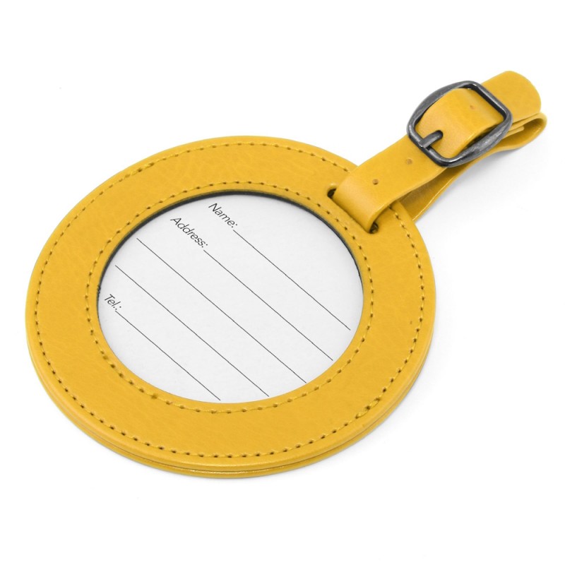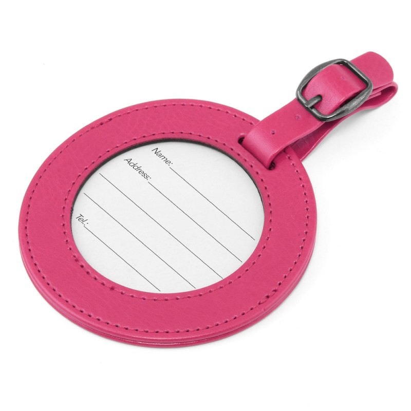 Etiquette à bagage ronde avec fenêtre transparente pour voir les coordonnées.