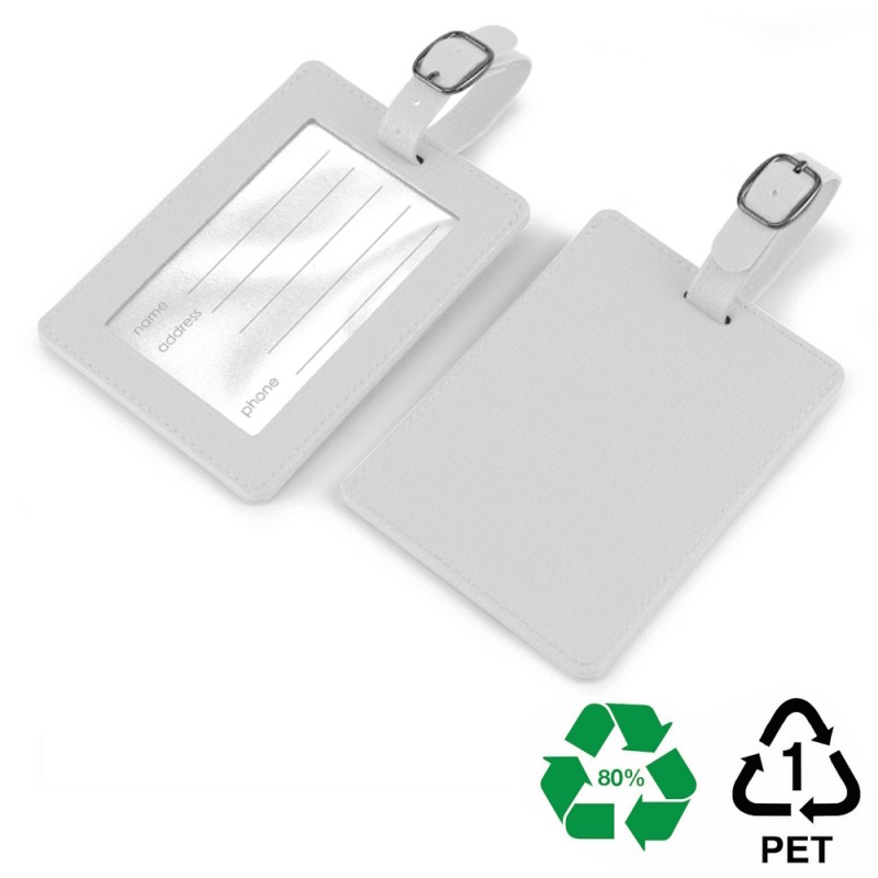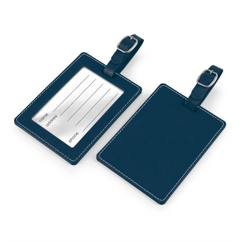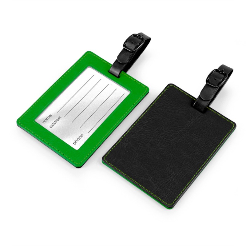 Etiquette à bagage doublée avec les bords repliés et cousus pour une finition de qualité.