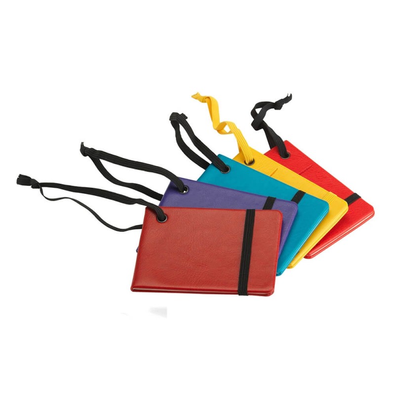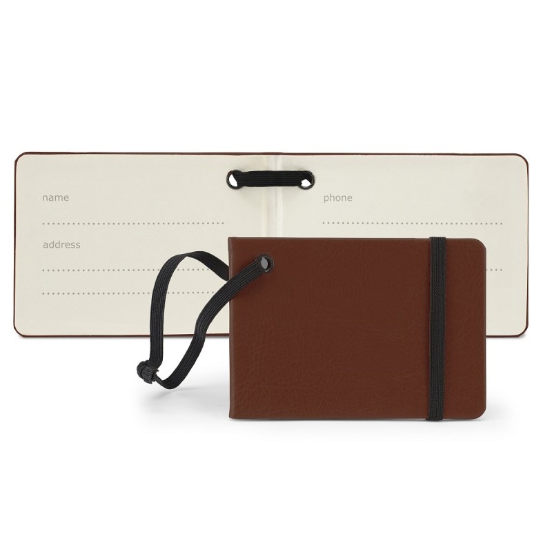 Etiquette à bagage façon carnet avec fermeture élastique.