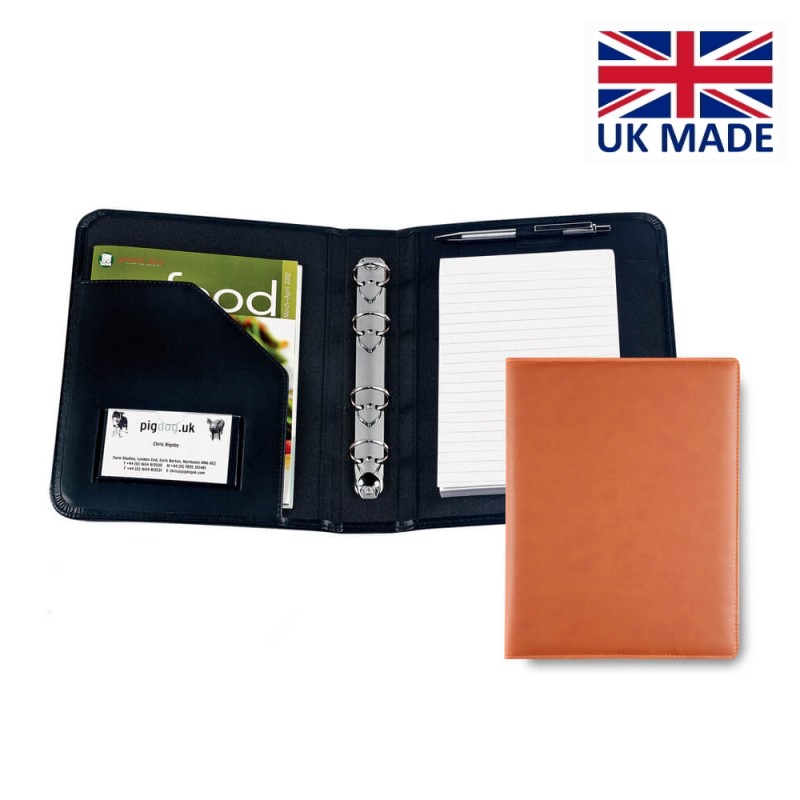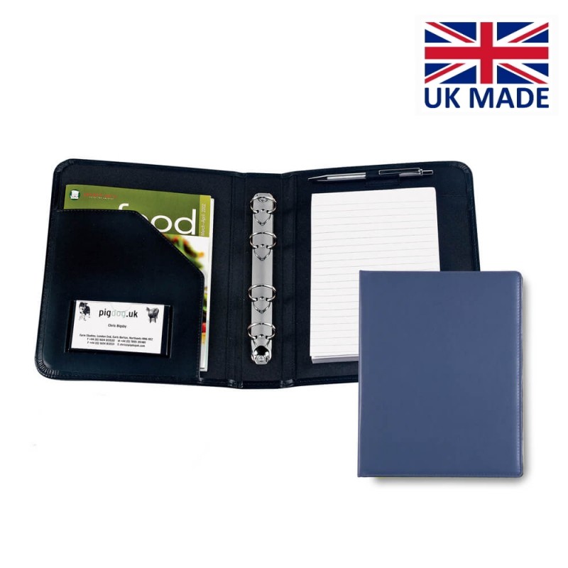 Classeur A5 avec anneaux avec couverture légèrement rembourrée et cousue.