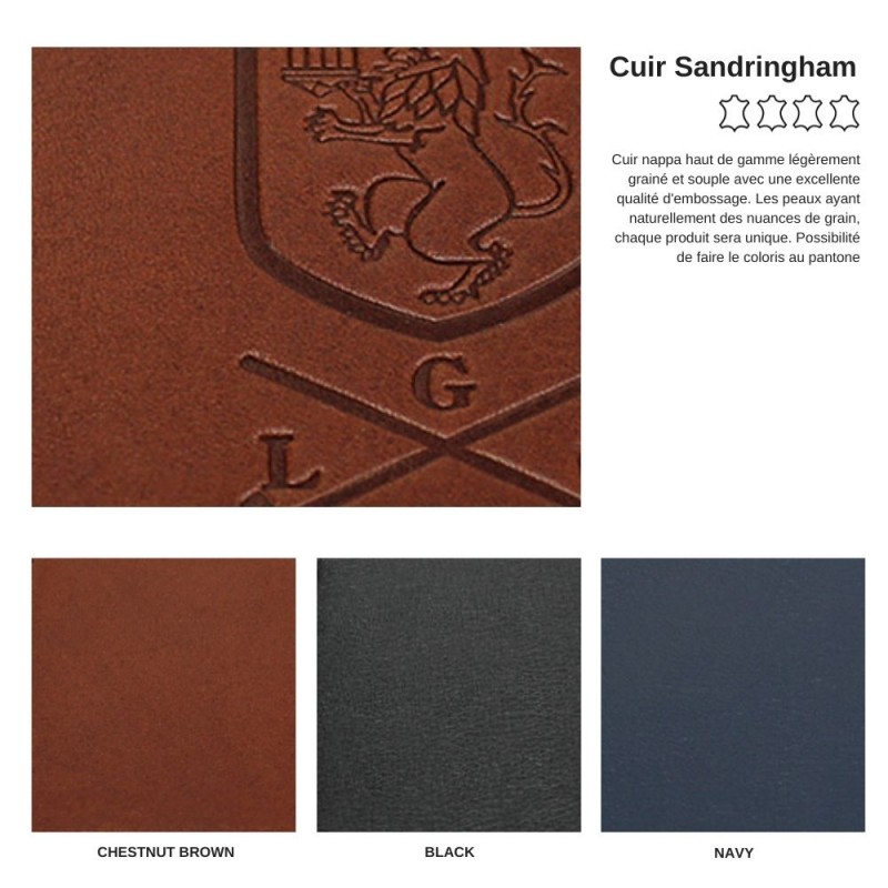 Cuir Sandringham: Le cuir Sandringham est un cuir nappa haut de gamme, légèrement grainé et souple avec une excellente qualité d'embossage (marquage en creux).